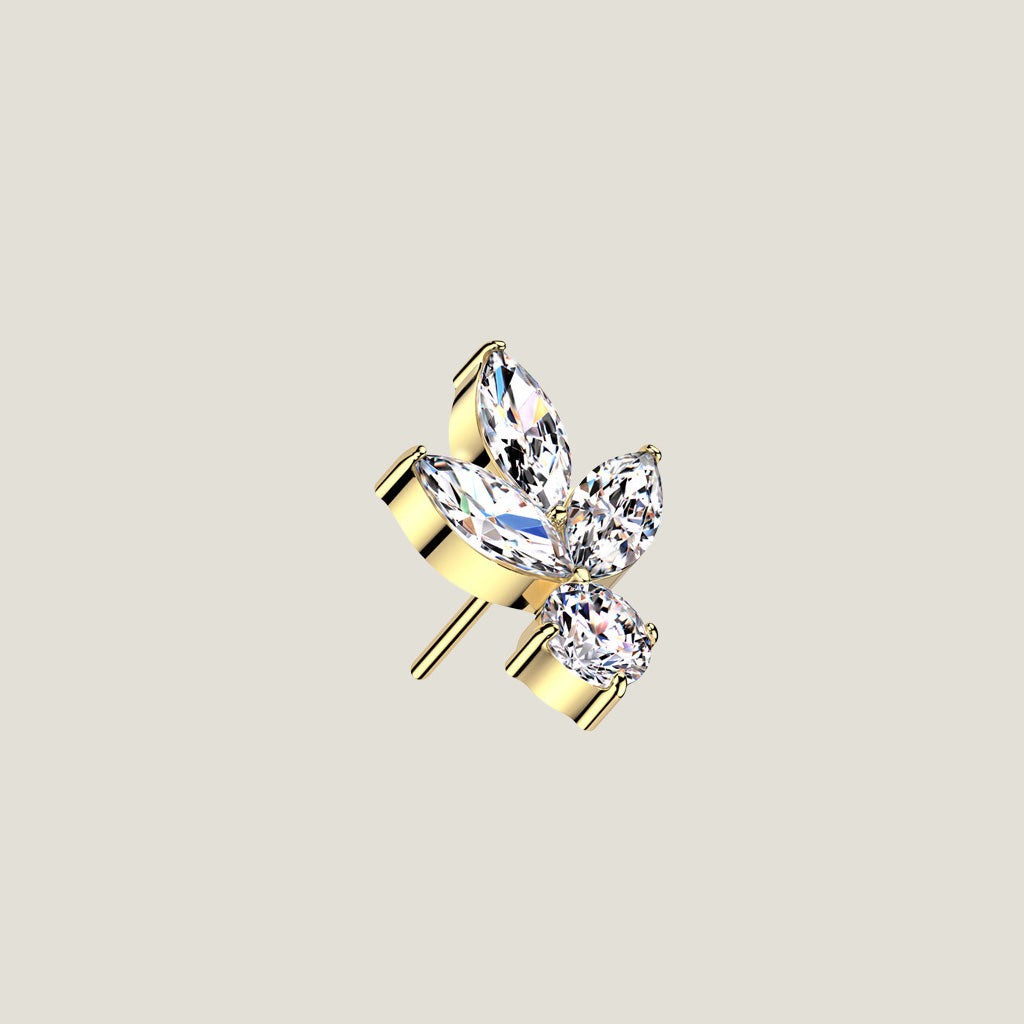 Crafted from implant-grade titanium, this threadless push-in jewelry features a stunning 3 marquise CZ leaf design with a round CZ top for added sparkle. Compatible with 14-20 gauge threadless posts, it combines durability with a unique, elegant look.